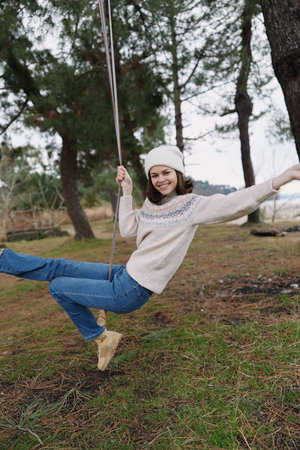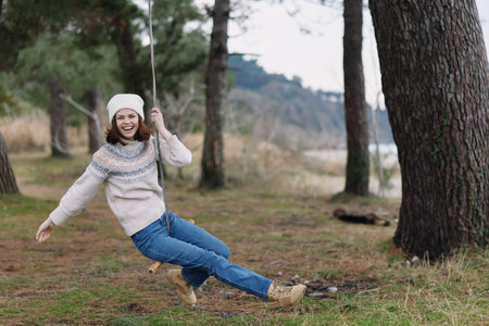 Outdoor swing scene with a playful woman in casual sweater and jeans, enjoying nature in a forest setting, capturing carefree movement and rustic charm for lifestyle stock photography