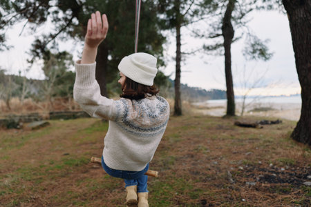 Outdoor swing in a forested park with a child wearing a knit sweater and beanie, swinging gently by a rope with distant lake and hills creating a tranquil nature scene