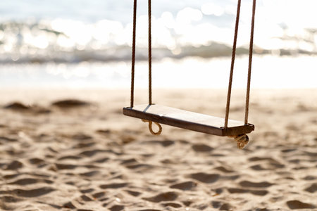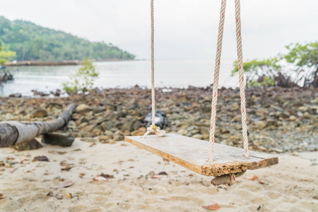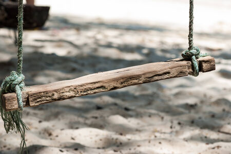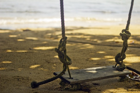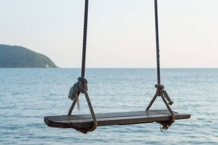 Wooden swing on a beach. Relaxing, peaceful vacation scene at the beach.