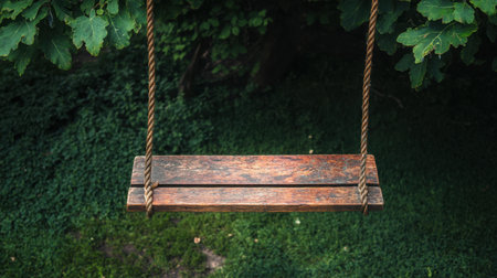 An empty wooden swing hangs silently in a softly lit green room, evoking a sense of quiet nostalgia and childhood memories. It waits patiently, a symbol of simple joys, solitude, and the peaceful passage of time.