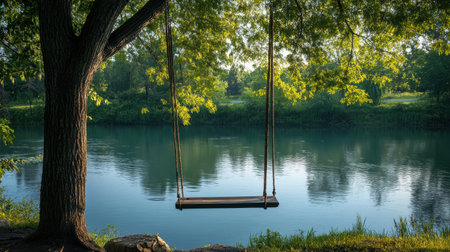 A wooden swing hangs from a large tree, gently swaying above a serene river