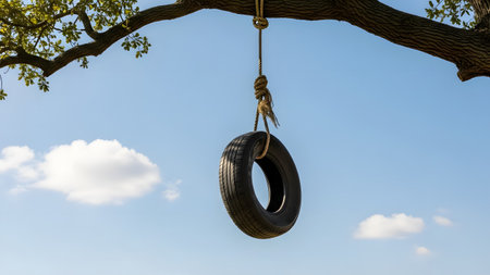 A classic black tire swing hangs by a rope from a sturdy tree branch against a clear blue sky with scattered clouds. The image evokes nostalgia, childhood playtime, and simple outdoor fun in a backyard or park.