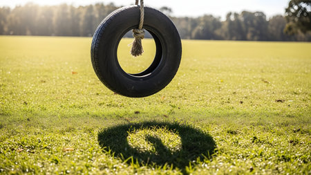 A classic black tire swing hangs from a thick rope in a sunny park with vibrant green grass. The scene captures a nostalgic summer atmosphere of childhood play and outdoor leisure with sunlight casting a shadow on the lawn.