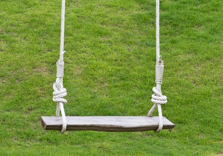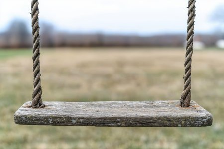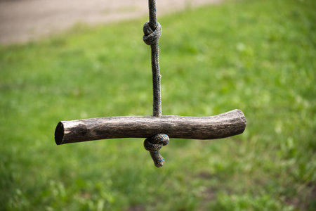 A close-up view of a simple wooden swing tied with a rope, set in a natural outdoor environment with green grass in the background, evoking nostalgia, simplicity, and a sense of childhood play.