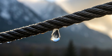 A crystal clear droplet clings to a rope, reflecting the majestic mountains and soft morning light.
