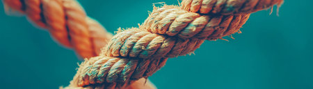 The image features a detailed close up of a thick natural rope tied in a secure knot displaying the intricate weave of fibers. The rope is highlighted against a backdrop of textured blue and rust tones creating a striking contrast that emphasizes the ropes rustic appearance. This visual captures the craftsmanship and utility of rope showcasing both its aesthetic appeal and functional design