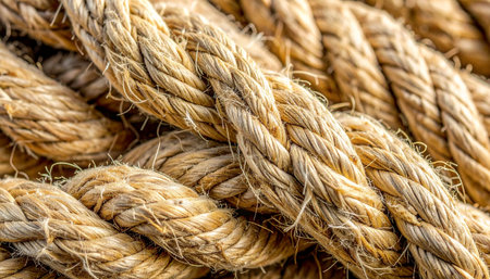 A detailed macro shot reveals the intricate weave of a heavy-duty rope, its natural fibers twisted together to create immense strength.