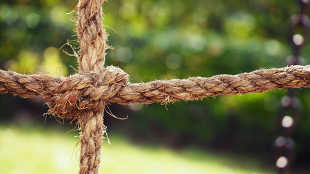 Close look at a tightly tied knot made of natural rope with soft sunlight in background
