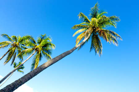 Summer holiday and tropical nature concept. Palm tree and blue sky in summertime