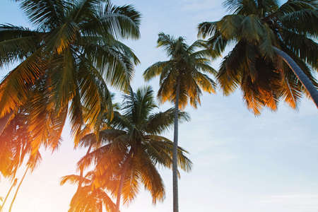 Tropical palm coconut trees on sunset sky flare and bokeh nature background.