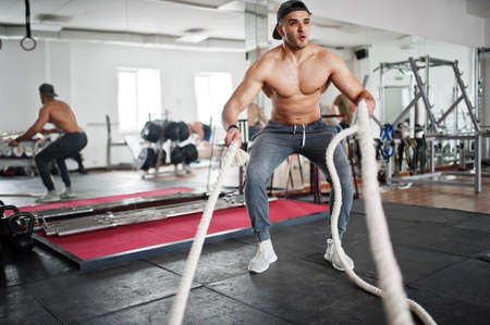 Fit and muscular arabian man working out with heavy ropes in gym.