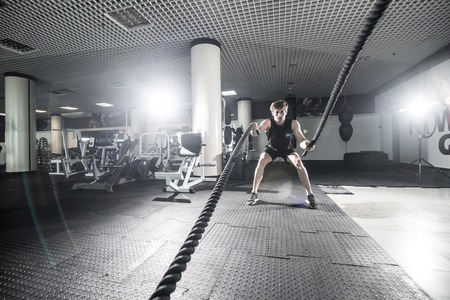 Crossfit with ropes. The athlete is training in the gym.