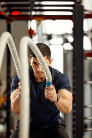Active man training with battle ropes waves in gym bodybuilding muscle strength intense cardio use sport equipment endurance practice powerful athlete sportsman bodybuilder workout functional exercise