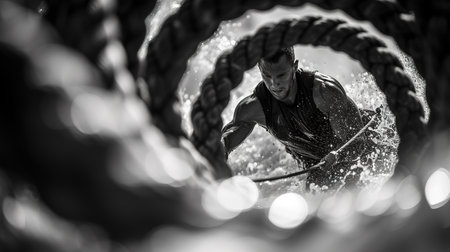 An intense battle rope workout session, with ropes undulating in a rhythmic pattern, highlighting the power and endurance of the athlete.