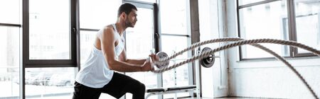 panoramic shot of strong sportsman exercising with battle ropes in modern gym