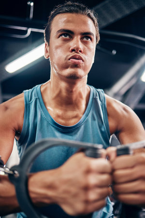 Workout, cable machine and health sweat of strong man breathing for endurance, power and exercise. Wellness, cardio and fitness mindset of focused athlete training body in professional gym.