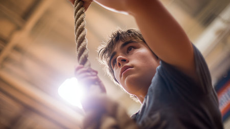 A teenage boy climbs a rope in a school gym during PE class, captured from a strong upward angle. His expression shows determination and focus, highlighting physical education.