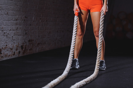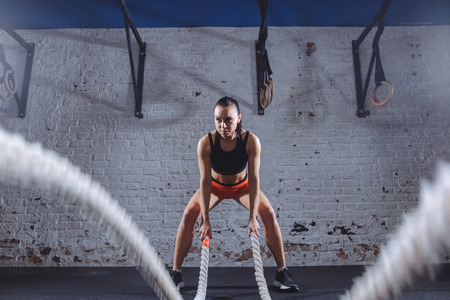 Young woman preparing to working out with battle ropes in cross fit gym