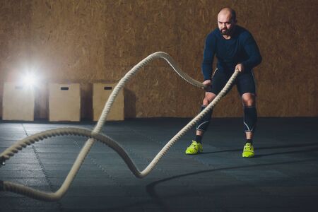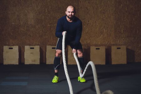 The athlete works with ropes in the gym. The concept of crossfit, healthy lifestyle, sports. Mixed media