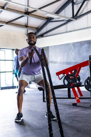 Two African American young male athletes are training with battle ropes in gym. Both have short hair and are wearing sporty outfits suitable for a workout.