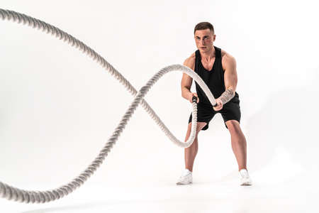 Attractive muscular man working out with heavy ropes. Photo of handsome man in sportswear isolated on white background. Crossfit