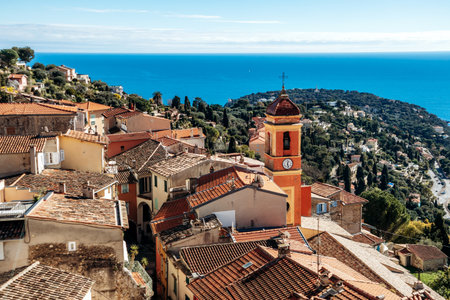 Panoramic view of Roquebrune village rooftops with Sainte Marguerite church bell tower and Cap Martin peninsula