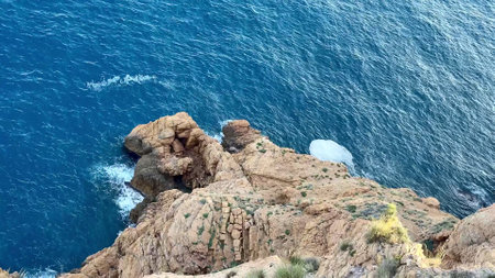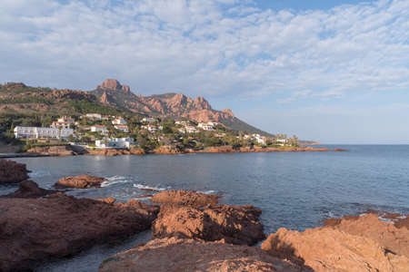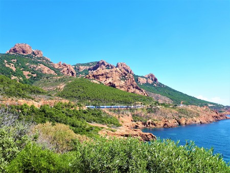 Views along Corniche d'Or or Corniche de l'Esterel beautiful coastal road, crystalline blue sea and sky combined with reddish color of Massif de l'Esterel mountains, travel destination in France, French Riviera