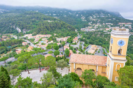 Daylight foggy view to Our Lady of the Assumption Church Clock Tower in Eze Village, French Riviera. Medieval Houses and green trees on background.