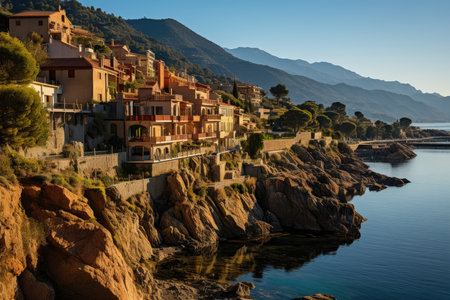 Charming Mediterranean Village with Rustic Rooftops Overlooking the Turquoise Sea on a Sunny Day
