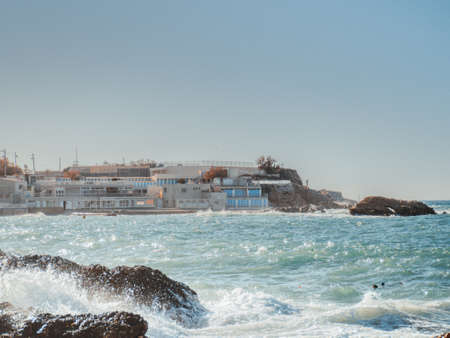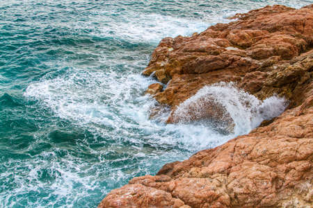 Sea waves with splashes crash on the coastal stones