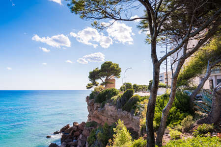 View of the coastline of the Costa Dorada in Miami Platja, Tarragona, Catalunya, Spain. Copy space for text