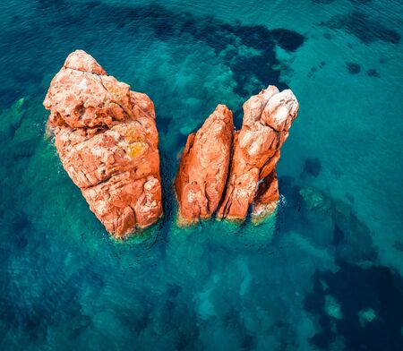 View from flying drone. Colorful summer view of Red Rocks Gli Scogli Rossi - Faraglioni on the di Cea beach. Aerial morning scene of Sardinia island, Italy, Europe. Beauty of nature concept background.