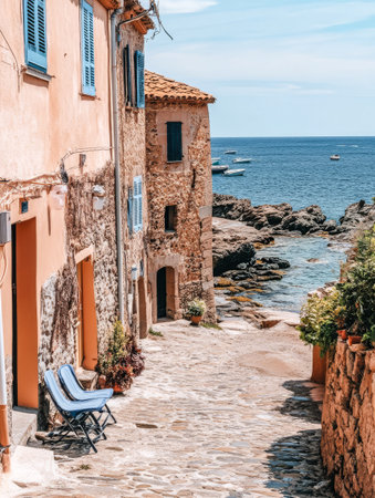 Cobblestone pathway winds through a quaint village by a serene coastline. Colorful houses line the street with boats gently floating in the clear blue water.