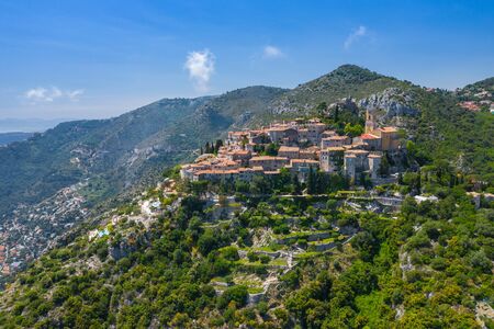 Aerial view of medieval village of Eze, on the Mediterranean coastline landscape and mountains, French Riviera coast, Cote d'Azur. France.