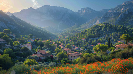 A picturesque village with terracotta roofs thrives in a vibrant green valley, surrounded by rugged mountains and a carpet of orange wildflowers.
