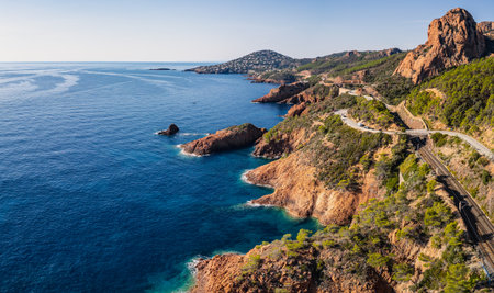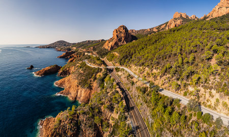 Panoramic aerial view of Esterel Mountains coastline with winding coastal road and railway tracks above the Mediterranean Sea, French Riviera, Southern France, scenic cliffs and oc
