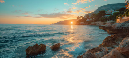 A serene beach scene at sunset with calm waves and a picturesque shoreline