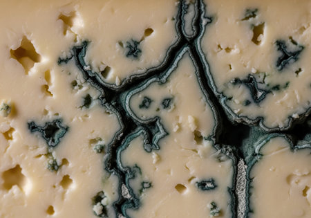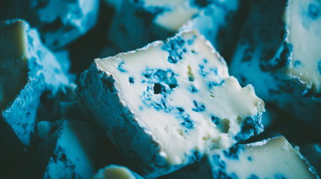 Macro close up of blue cheese texture, highlighting the intricate network of dark blue mold veins and creamy, porous structure. gourmet food and dairy concept.