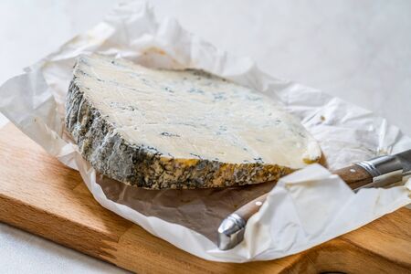 Whole Roquefort French Blue Cheese with Knife on Wooden Board. Organic Artisan Food.