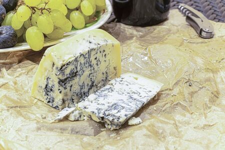 A piece of blue cheese and grapes. Gourmet products.