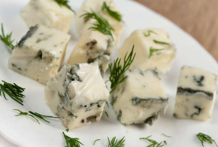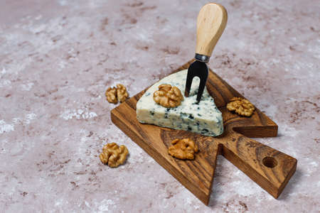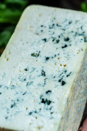 Blue cheese made from cow milk with Penicillinum mold, tasty soft cheese with specific odor close up