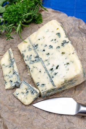 Piece of French blue cheese Roquefort, made from sheep milk in caves of Roquefort-sur-Soulzon, France