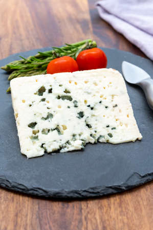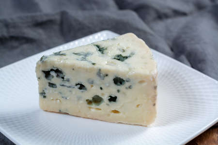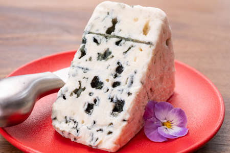 Cheese collection, piece of soft French blue cheese roquefort close up