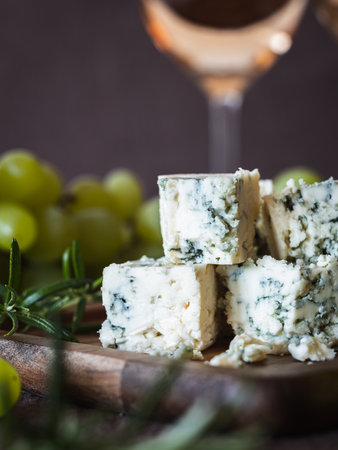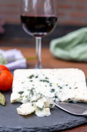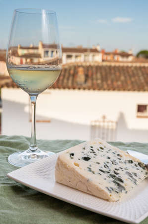 Cheese collection, semi-hard French blue cheese roquefort from Roquefort-sur-Soulzon, France, served with sweet cold white french wine, close up