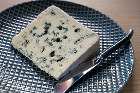 Tastig of French king of cheeses, sheep milk blue cheese roquefort from Southern France, close up