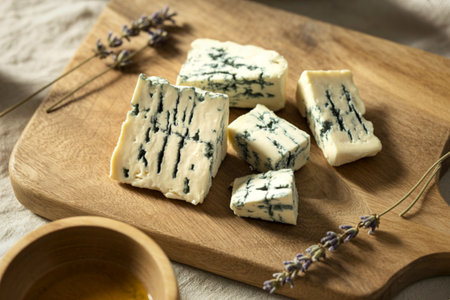 Several pieces of blue cheese with prominent blue veins are artfully arranged on a rustic wooden cutting board, accented by dried lavender sprigs.