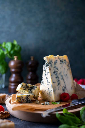 Blue cheese, dor blue or roquefort mold cheese slice on cutting board with basil leaves and rasberries, lifestyle food