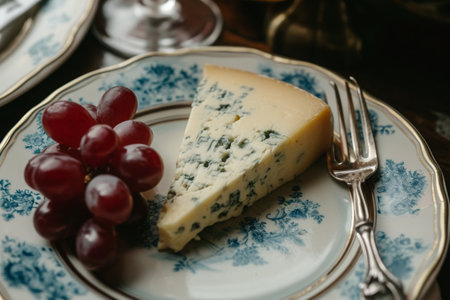 A plate showcasing a piece of cheese and a cluster of grapes, arranged neatly, Plate with a slice of English Stilton gold cheese, AI Generated