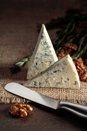 Blue cheese with walnuts and rosemary on an old wooden table.