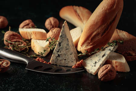 Blue cheese with baguette, walnuts, and thyme. Traditional Mediterranean snacks.